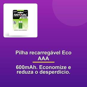 Pilha Recarregável Eco Aaa 600mah C/2 Aqui está a descrição do produto: Essas pilhas recarregáveis Eco AAA são a escolha certa para equipamentos com alto consumo de energia e uso recorrente. Diferente das pilhas alcalinas, elas duram até 3x mais por carga e podem ser recarregadas até 1.500 vezes. Isso significa que uma única pilha recarregável equivale a 1.500 pilhas alcalinas. Confira como ela pode revolucionar seu uso de pilhas.