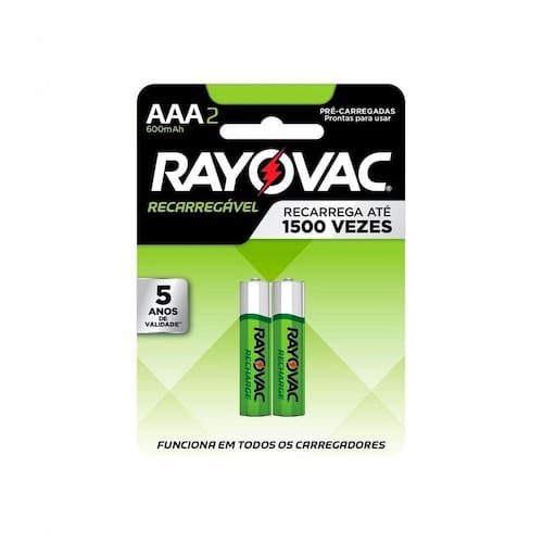 Pilha Recarregavel Eco Aaa Com 2 600mah 55902 Recarregáveis Econômicas Elas duram até 3x mais por carga do que as alcalinas e podem ser recarregadas até 1.500* vezes. É a opção ideal para equipamentos com alto consumo de energia e uso recorrente. Uma recarregável Rayovac equivale a 1500 pilhas alcalinas. Testes realizados em câmera digital. Os resultados podem variar de acordo com o equipamento utilizado. Vantagens das Recarregáveis As Pilhas Recarregáveis Rayovac oferecem muitas vantagens para usuários que usam constantemente aparelhos de alto consumo de energia. Confira os benefícios abaixo: SUSTENTABILIDADE O uso de pilhas recarregáveis reduz o número de pilhas descartadas. Dessa forma o impacto ambiental é reduzido drasticamente. EFEITO MEMÓRIA As Pilhas Recarregáveis Rayovac não têm efeito memória, ou seja, ela não perde sua capacidade energética caso não seja recarregada completamente. PRONTA PARA USO Todas as Pilhas Recarregáveis Rayovac vêm carregadas e prontas para usar. EM QUALQUER CARREGADOR Fabricadas com a tecnologia NiMH, as Pilhas Recarregáveis Rayovac podem ser recarregadas em qualquer carregador. RETENÇÃO DE CARGA As Pilhas Recarregáveis Rayovac são capazes de manter a carga por até 6 meses quando não estão sendo usadas. Recarregáveis Econômicas Elas duram até 3x mais por carga do que as alcalinas e podem ser recarregadas até 1.500* vezes. É a opção ideal para equipamentos com alto consumo de energia e uso recorrente. Uma recarregável Rayovac equivale a 1500 pilhas alcalinas. Testes realizados em câmera digital. Os resultados podem variar de acordo com o equipamento utilizado. Vantagens das Recarregáveis As Pilhas Recarregáveis Rayovac oferecem muitas vantagens para usuários que usam constantemente aparelhos de alto consumo de energia. Confira os benefícios abaixo: SUSTENTABILIDADE O uso de pilhas recarregáveis reduz o número de pilhas descartadas. Dessa forma o impacto ambiental é reduzido drasticamente. EFEITO MEMÓRIA As Pilhas Recarregáveis Rayovac não têm efeito memória, ou seja, ela não perde sua capacidade energética caso não seja recarregada completamente. PRONTA PARA USO Todas as Pilhas Recarregáveis Rayovac vêm carregadas e prontas para usar. EM QUALQUER CARREGADOR Fabricadas com a tecnologia NiMH, as Pilhas Recarregáveis Rayovac podem ser recarregadas em qualquer carregador. RETENÇÃO DE CARGA As Pilhas Recarregáveis Rayovac são capazes de manter a carga por até 6 meses quando não estão sendo usadas. Ean: 7702094190034