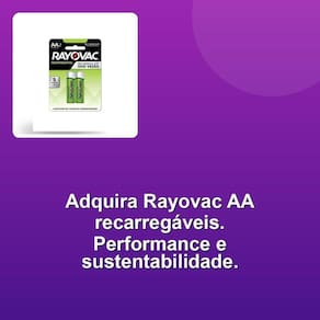 Todas as pilhas recarregáveis Rayovac vêm carregadas e prontas para usar, e são capazes de manter a carga quando não estão em uso. Além disso, podem ser recarregadas em qualquer carregador, graças à tecnologia NiMH. Isso significa que você pode usar e reusar suas pilhas quantas vezes quiser, reduzindo seu impacto ambiental e economizando dinheiro.