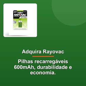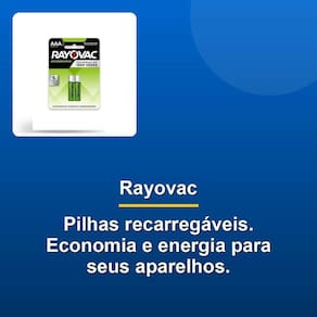 Além de todas essas vantagens, você também ganha com a conveniência de ter duas pilhas na embalagem, o que significa que você sempre terá uma reserva para quando precisar. A escolha perfeita para os seus equipamentos que consomem muita energia e precisam de uso recorrente. As pilhas recarregáveis Rayovac vem pré-carregadas e prontas para uso, oferecendo uma economia vantajosa em relação às pilhas Alcalinas. Com uma capacidade de 600MAH, elas duram mais 200% em comparação com as pilhas Alcalinas em câmeras digitais, permitindo que você use seus brinquedos, câmeras, controles de video-games, mouse e teclados por mais tempo.