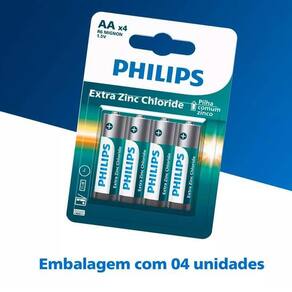 Pilha Zinco Philips Aa R03l4b/59 4 Und Especificações técnicas - AA - Cloreto de zinco extra Composição química: - Cloreto de zinco - Metais pesados - Sem Cd - Sem Hg Material de embalagem: - Papelão Tipo da embalagem: - PET blister GTIN: - 14895229152011 Marca: Não Informado Ean: 4895229152021