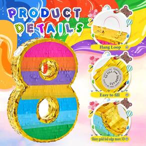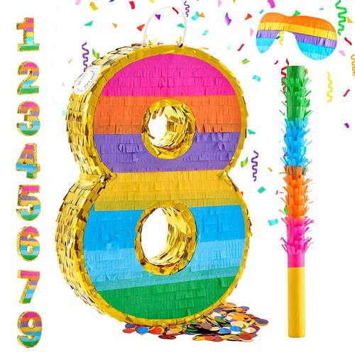 Pinata, número arco-íris, 1-9 - Decorações de aniversário perfeitas: decore a festa de aniversário de suas meninas ou meninos com esta pinhata número 8 de cor brilhante que combina com bordas de folha de ouro brilhante mais 3D. É uma maneira divertida e única de interagir com convidados em uma festa. As crianças ficarão encantadas em ver esta pinhata visualmente atraente em sua festa de aniversário. - Fácil de usar e preencher: A pinhata de aniversário mede 42 x 29 x 7,6 cm com um orifício pré-fabricado e um laço de pendurar resistente na parte superior para pendurar facilmente em qualquer lugar. Basta cortar uma abertura na parte superior para preencher com doces variados, chocolates, confetes e lembrancinhas para crianças (o pacote inclui apenas confetes) - Material premium: a piñata infantil é feita de papel ondulado grosso. Design de superfície multicolorida e linda borda de folha dourada, elegante e durável. Embalagem resistente sem se preocupar em apertar. Todos terão a chance de acertar e criar lindas memórias! - Várias cenas: Pequena pinhata de aniversário ideal para pendurar em uma árvore, grade ou telhado como uma excelente sessão interativa, e aproveite a diversão tradicional juntos. Também pode ser exibido em mesas de jantar ou sobremesa como uma peça central atraente. - Pacote completo: inclui 1 pinata número 8 arco-íris, 1 palito, 1 venda e confetes de 30 g que podem ser preenchidos dentro da sua piñata. Adiciona um toque vibrante ao seu aniversário ou festa temática de festa. Peça nossa piñata número 8 com confiança e ofereça uma garantia vitalícia!