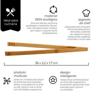 MATERIAL 100% ECOLÓGICO: Feito em bambu de ótima qualidade, resistente, flexível e leve. Não absorvente, inodoro, sem sabor, sem substância tóxica e naturalmente antibacteriano. Suas fibras não possuem poros, não havendo acúmulo de resíduosDESIGN: Feita em bambu nossa pinça culinária possui um formato ergonômico confortável. Usando nossa pinça você terá mais precisão para cozinhar ou então empratar seus pratos. Medidas: Comprimento: 36cm Largura: 2,2cm e altura: 1,7cm e pesa 45 gramas