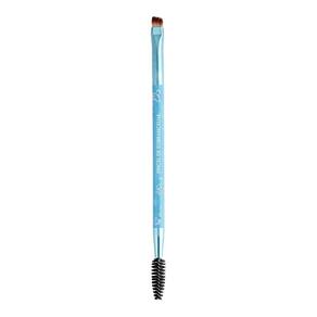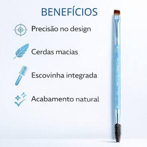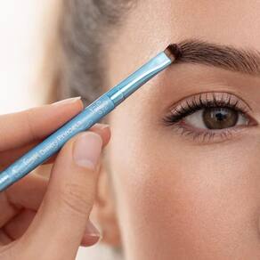 Utilize o pincel para preencher e definir as sobrancelhas com sua sombra ou produto favorito. Comece aplicando o produto no centro da sobrancelha e siga o formato natural, esfumando para um acabamento perfeito. Use a ponta do pincel para detalhes e correções.