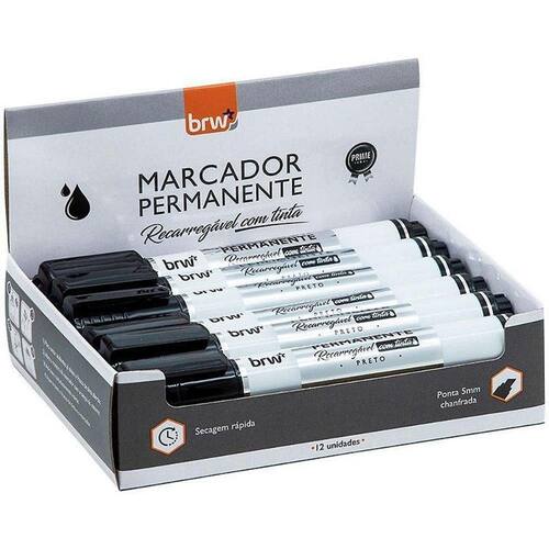 Com corpo robusto e prateado, o Marcador Permanente Recarregavel Preto Prime BRW une o design bonito e moderno com alto rendimento e extrema qualidade . A tinta possui cor intensa com rapida secagem e fixacao, o que proporciona tracos uniformes e sem falhas. Sua ponta de fibra nao deforma ao entrar em contato com variadas superficies, inclusive as mais rusticas. E seu formato chanfrado possibilita duas espessuras diferentes para marcar e escrever. Nao toxico, com baixo odor e resistente a agua, pode ser utilizado em metais, vidros, plasticos, madeiras, papelao e ate mesmo cartolinas. Embalagem: CX.C/12. Referência: CA7012 Marca: Não Informado Ean: 7898613212667