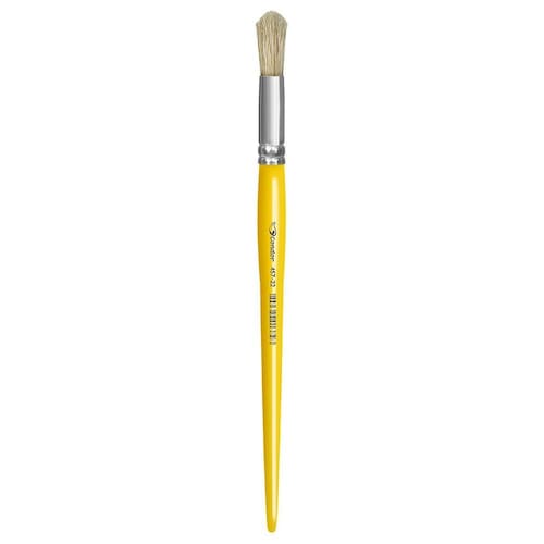 Ponta: cerdas brancas especiais. Cabo: longo madeira amarelo. Virola: alumínio. Indicação de pintura: tela tecidos painel mural. Formato: redondo. Composição: cerda natural, madeira, metal e material sintético.