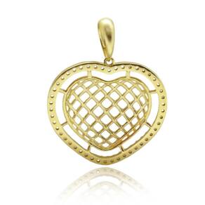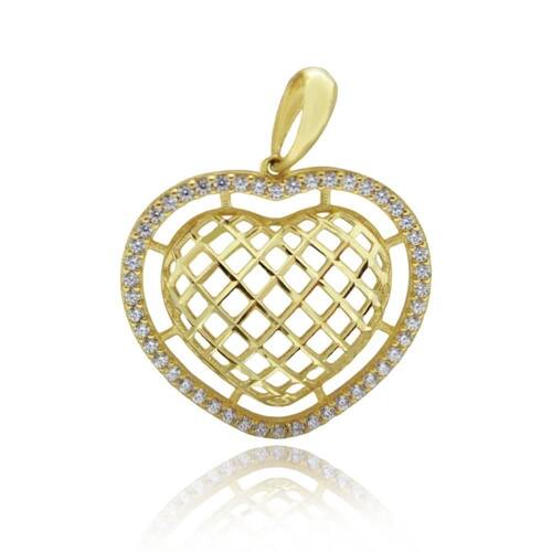 O design do pingente é tradicional e elegante com 2,5 cm, com detalhes intricados e finamente trabalhados que adicionam um toque de sofisticação à peça. Possui um coração cravejado com aproximadamente 50 zircônias que realça a textura e os detalhes do pingente, criando um contraste deslumbrante entre a riqueza do metal e a beleza do design.