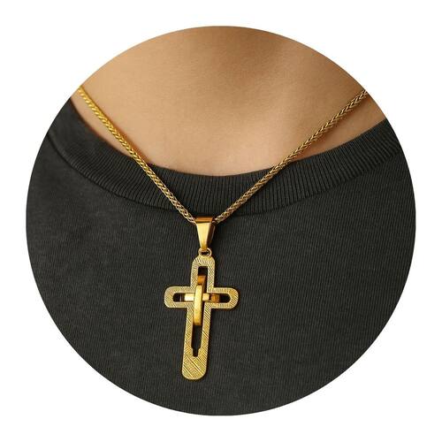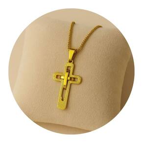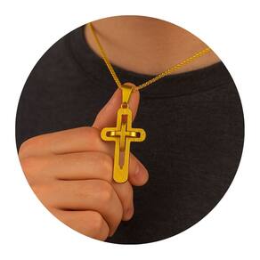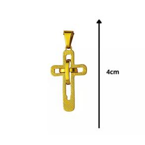 Pingente cruz dupla em aço inox dourado, design moderno com duas camadas sobrepostas que proporcionam um visual sofisticado e imponente. Fabricado em material resistente e de alta durabilidade, não oxida e mantém o brilho por muito mais tempo. Ideal para uso diário ou para compor looks com estilo e personalidade.