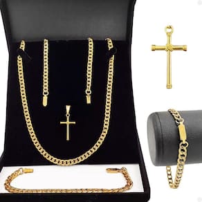 Kit de Acessórios Masculinos Banhados a Ouro 18K - Corrente Grumet, Pingente de Cruz e Pulseira