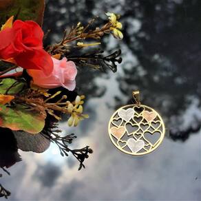 01 Pingente Dourado Redondo com Coração em 3 Ouros: Amarelo, Rosé e Branco.