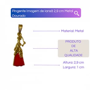 O Pingente Imagem de Iansã 2,9 cm Metal Dourado da Bialluz é de alta qualidade feitos de forma artesanal com muito carinho. É perfeito para qualquer pessoa. Cheia de boas energias e carregada de fé nosso pingente emanará muita paz em sua vida!
