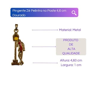 Pingente Zé Pelintra no Poste 4,6 cm Dourado Pingente Zé Pelintra no Poste 4,6 cm Dourado O Pingente Zé Pelintra no Poste 4,6 cm Dourado da Bialluz é de alta qualidade feitos de forma artesanal com muito carinho. É perfeito para qualquer pessoa. Cheia de boas energias e carregada de fé nosso pingente emanará muita paz em sua vida Enviamos a seu produto em até 24 horas após a confirmação de pagamento Tamanho: 4,6 Material: Zamac liga metálica Cor: Metal Dourado Caso tenha alguma dúvida nos mande mensagem que respondemos rapidinho para te ajudar da melhor forma possível Marca: Meta Atacado