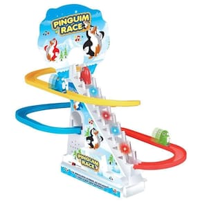 A corrida já vai começar O Jogo Pinguim Race é muita diversão. Com luzes e sons divertidos, os pinguins vão subindo a escada para deslizar pelas rampas até voltar ao início da escada Brincadeira sadia e divertida Será que você sairá vencedor dessa corrida Os pinguins sobem as escadas e deslizam nas rampas com som e luzes CONTÉM: - 1 escada; - 1 painel; - 3 pinguins; - 3 rampas.