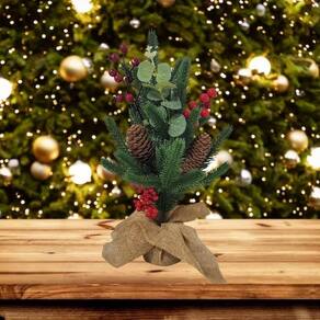 Adicione um toque sofisticado e natural à sua decoração com este pinheiro decorativo de luxo. Com 40 cm de altura, ele é ideal para mesas, aparadores ou prateleiras. Sua base em juta rústica traz um charme acolhedor, enquanto a decoração com pinhas naturais e ramos de azevinho adiciona elegância e simbolismo natalino.