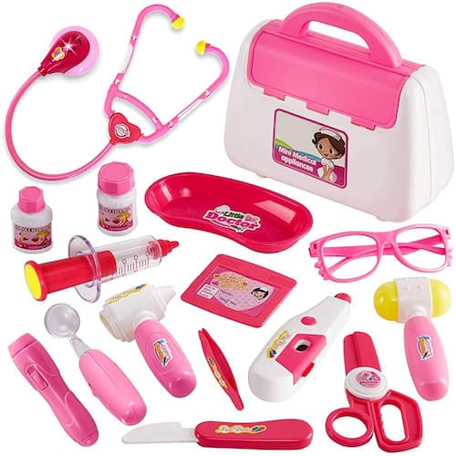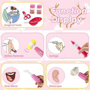 Tamanho da mala médica - 21 * 9 * 19cm. Recomendado para crianças de 3 anos ou mais. por favor, use sob a supervisão direta de um adulto. 16 Peça Kit Infantil Médico - 1 esteoscópio, 1 otoscópio, 1 lanterna, 1 seringa, 1 pinça, 1 martelo reflexo, 2 frascos de remédio, 1 par de tesouras, 1 bisturi, 1 etiqueta de nome, 1 bandeja, 1 óculos, 1 mala, etc. Ferramentas de medicina com luzes e som - O estescópio pode não só colocar luzes, mas também colocar sons como batidas realistas de spa. Jogo imaginativo. Dê às crianças mais diversão para brincar. Kid Doctor Imitation Game - Ele fornece às crianças adereços de jogo de papel de alta qualidade, deixe seu filho experimentar o que é ser médico e enfermeiro , enquanto supera indiretamente o medo de injeções.