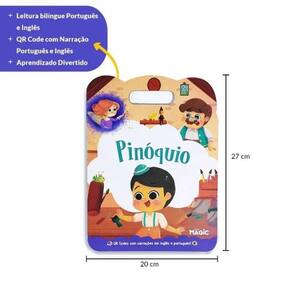 Pinóquio é uma história encantadora que leva os pequenos leitores a uma jornada divertida e educativa. Com ilustrações vibrantes e um formato cartonado com alça, este livro foi especialmente desenvolvido para facilitar o manuseio pelas mãos pequenas, tornando a leitura ainda mais divertida. A história é bilíngue, com textos em Português e Inglês, permitindo que as crianças aprendam dois idiomas de forma lúdica e interativa além disso o livro também conta com um QR Code que oferece narração da história, tanto em Português quanto em Inglês, proporcionando uma experiência imersiva e dinâmica. Com temas variados, a coleção Cartonado com Alça da Magic Kids, conta com histórias que estimulam a imaginação e o aprendizado, sendo perfeitas para leituras compartilhadas entre pais e filhos, oferecendo momentos de diversão e descobertas tornando-se essencial para incentivar o amor pela leitura desde cedo. Destaque Leitura bilíngue: Textos em Português e Inglês, ajudando no aprendizado de dois idiomas. Narração interativa: QR Code com narração em ambos os idiomas, proporcionando uma experiência rica e dinâmica. Aprendizado divertido: Histórias envolventes que estimulam a imaginação e o desenvolvimento linguístico das crianças