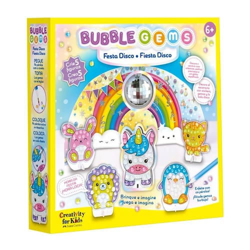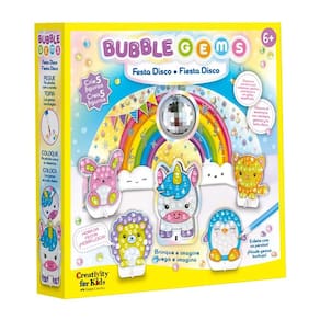 Adicione uma dimensão brilhante aos seus trabalhos tradicionais de colorir com as pintura Bubble Gems! Este kit apresenta a alegria da pintura de diamante para as crianças de uma forma inusitada, mas simples, com grandes pedras brilhantes, uma caneta fácil de usar e imagens adoráveis para elas criarem e exibirem com orgulho sua própria arte de diamante.