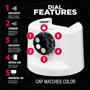 - O mostrador 5 em 1 em spray personalizado oferece cinco padrões de tinta spray para melhor controle e resultados superiores