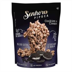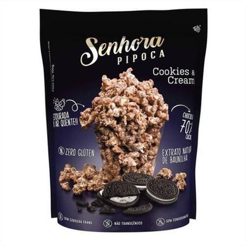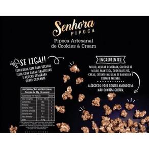 Pipoca Cookies And Cream 100G Pipoca artesanal estourada no ar quente, sem óleo, sem conservantes, sem aromatizantes. Marca: Senhora Pipoca Produzida com chocolate 70% e extrato natural de baunilha. 100 gramas Armazenamento em local seco e arejado. Se surpreenda: Estourada no ar quente sem óleo ; Zero glúten; Sem aromatizante;