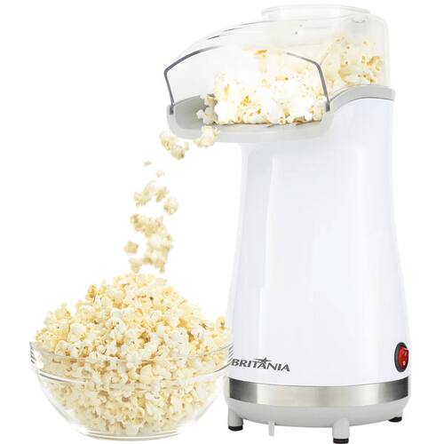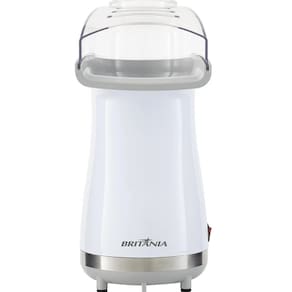 Pipoqueira elétrica Britânia 1000W, prepara pipoca sem óleo, com dosador para milho e manteiga, chave liga/desliga e pés antiderrapantes.Luz indicadora de funcionamento