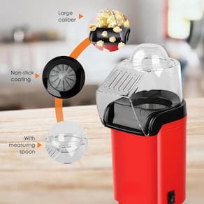 Pipoqueira elétrica sem óleo, prepara 100g de pipoca em aproximadamente 3,5 minutos, bico direcionador para jogar a pipoca direto no recipiente.