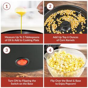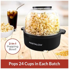 Pipoqueira elétrica Nostalgia preta com capacidade de 5,6 litros, prepara até 24 xícaras de pipoca por vez, aquecimento rápido em 3 minutos, tigela ventilada, haste de agitação motorizada e copo medidor de kernel.Luz indicadora de funcionamento