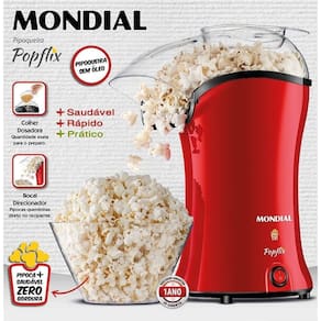 Pipoqueira Elétrica Mondial Popflix Pp-03 Vermelha - 220VSuas séries, filmes e jogos ganham mais sabor com a pipoqueira mondial popflix pp-03. Fácil de usar e rápida no preparo, ela estoura os grãos de milho através de um sistema de ar quente, sem a necessidade de usar óleo. As pipocas ficam quentinhas, crocantes e mais saudáveis. Acompanha colher dosadora, com a medida certa para cada porção, não queima os grãos e não desperdiça. Em menos de 5 minutos você tem pipocas saborosas saindo do bocal direcionador direto para sua tigela preferida. Com a popflix pp-03 da mondial você tem sucesso garantido, afinal, menos sujeira e cheiro de óleo pela casa e mais sabor para assistir seus programas preferidos com os familiares e amigos em casa a qualquer hora do dia.Características: Marca: mondial Modelo: popflix pp-03 Tempo de preparo: 5 minutos Potência watts : 1.200w Consumo: 1,2kw/h Voltagem: 220v não é bivolt, selecionar a voltagem correta . - charmosa e moderna - rápida e prática - pipoca crocante e quentinha sem óleo - colher dosadora: medida certa para cada porção - base antiderrapante: estabilidade durante o uso - bocal direcionador: pipocas quentes direto na tigela - botão liga/desliga: indica funcionamento do produto - quantidade máxima de produção por vez em gramas: 100g - sistema de aquecimento uniforme estouram os milhos sem a necessidade de uso de óleo - guarda-fio: permite ajustar o comprimento do cabo e facilita a hora de guardar o produto - devido às constantes evoluções tecnológicas, o produto poderá ser atualizado apresentando pequenas alterações sem prévio aviso.Conteúdo da embalagem: - 01 pipoqueira mondial popflix pp-03 - vermelha - 01 colher dosadora - manual de instruções Dimensões da embalagem e peso bruto aproximado: Altura 33cm x largura 26cm x profundidade 18cm Peso: 1,050kgGarantia da fabricante: 12 meses de garantia 9 meses de garantia contratual junto ao fabricante + 3 meses referentes à garantia legal, nos termos do artigo 26, ii, do código de defesa do consumidor