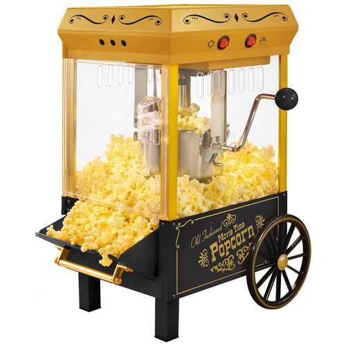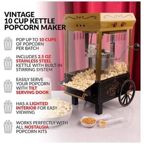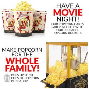 PIPOCA DE CINEMA EM CASA Seja noite de cinema ou hora do lanche, este carrinho de pipoca aparece até 10 xícaras de pipoca de cinema por lote para manter os baldes de pipoca cheios KITS DE PIPOCA NOSTALGIA Todos os kits de pipoca Nostalgia funcionam perfeitamente com este pipoqueiro Kit de ar quente e chaleira de teatro KPK400, tigelas de pipoca reutilizáveis PPB600, kit de pipoca de óleo de coco pré medidas PCSP5 CAPACIDADE A chaleira de aço inoxidável contém 73 mL de grãos de pipoca e é projetada com um sistema de agitação de grãos embutido e tampa com dobradiça dupla para esvaziar facilmente a pipoca. INTERIOR ILUMINADO O interior iluminado cria um ambiente de sala divertido e agradável e a câmara de estouro de 360 graus permite que você assista sua pipoca estourar PORTA DE SERVIR INCLINADA Equipada com uma porta basculante, colher e servir pipoca nunca foi tão fácil com esta máquina de pipoca OLHAR VINTAGE As rodas decorativas ajudam a dar a este carrinho uma visão única dos carrinhos de pipoca vintage do início do século XIX INCLUÍDO Copo medidor de kernel, colher medidora de óleo e uma colher de pipoca estão incluídos