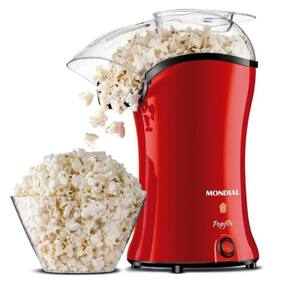 Pipoqueira elétrica Mondial Red, 1200W, prepara pipoca em menos de 3 minutos com ar quente, sem óleo. Possui bocal direcionador, tampa dosadora, sistema de proteção contra superaquecimento e porta-fio.Preparação