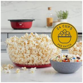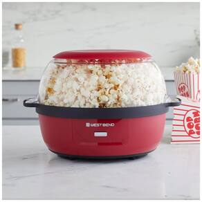 Pipoqueira elétrica West Bend Stir Crazy com capacidade para 24 xícaras, haste misturadora motorizada, tampa de uso duplo como tigela, alças resistentes ao calor e superfície antiaderente.Luz indicadora de funcionamento