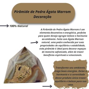Pirâmide de Pedra Ágata Marrom Decoração Pirâmide de Pedra Ágata Marrom Decoração A Pirâmide de Pedra Ágata Marrom é um elemento decorativo e energético, perfeito para quem deseja agregar beleza e harmonia ao ambiente. Feita com Ágata Marrom natural, uma pedra conhecida por suas propriedades de equilíbrio e estabilidade, esta pirâmide é ideal para decorar espaços de maneira sofisticada, além de trazer benefícios espirituais e emocionais. A Ágata Marrom, com suas cores terrosas e padrões únicos, transmite uma sensação de acolhimento e conexão com a terra, favorecendo a paz interior e a proteção. A forma piramidal potencializa as energias da pedra, criando uma atmosfera de harmonia e fortalecendo a energia do ambiente. Benefícios: Equilíbrio e Estabilidade: A Ágata Marrom é uma pedra que promove estabilidade emocional, ajudando a equilibrar as energias do ambiente e proporcionando um estado de tranquilidade e serenidade. Proteção Energética: A pirâmide de Ágata Marrom atua como um poderoso protetor de energias negativas, criando uma barreira que filtra vibrações indesejadas e promove um ambiente mais seguro e harmonioso. Atenuação de Ansiedade e : Ideal para quem busca um auxílio contra ansiedade, o ou tensões emocionais, essa pedra ajuda a aliviar esses sentimentos, promovendo um estado mental mais calmo e focado. Decoração Sofisticada: Além de suas propriedades espirituais, a pirâmide de Ágata Marrom é uma peça decorativa elegante e atemporal, que combina com diversos estilos de interiores, desde os mais modernos até os mais tradicionais. Apoio ao Crescimento Pessoal: A pirâmide também pode auxiliar na superação de obstáculos e no desenvolvimento de uma maior autoestima, trazendo uma energia que incentiva o autoconhecimento e a evolução pessoal. Esta pirâmide de Ágata Marrom é um excelente item tanto para quem busca benefícios energéticos quanto para quem deseja embelezar seu espaço com um toque de elegância e espiritualidade. Ideal para escritórios, salas de meditação, quartos ou qualquer ambiente onde a paz e o equilíbrio sejam desejados. Enviamos a sua peça em até 24 horas após a confirmação do pagamento Caso tenha alguma dúvida nos mande mensagem que responderemos rapidinho para te ajudar