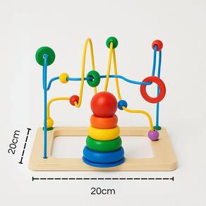 Além do labirinto de arames, o brinquedo também possui uma torre de montagem com peças de madeira que variam do maior para o menor tamanho. A criança é incentivada a empilhar corretamente, o que fortalece o controle das mãos e o entendimento sobre ordem e proporção. Esse tipo de atividade favorece o desenvolvimento da coordenação motora fina, essencial para tarefas como desenhar, recortar e escrever no futuro.