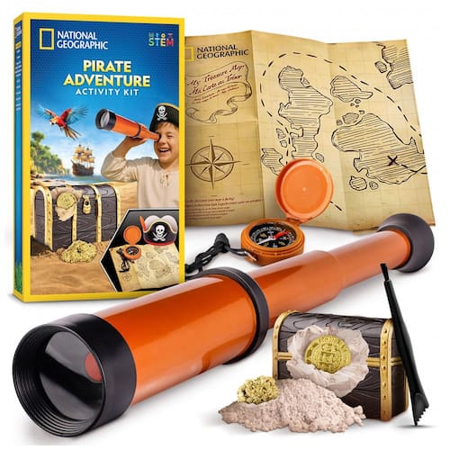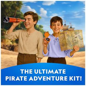 O Pirate Adventure Activity Kit da National?Geographic é uma jornada interativa ao mundo dos piratas que une aprendizado e diversão em um só conjunto. As crianças começam escavando um bloco para desenterrar um tesouro, usam as ferramentas fornecidas para revelar uma réplica de “doubloon” e um espécime de pirita, e em seguida fabricam seu próprio chapéu de pirata e criam um mapa do tesouro personalizado com adesivos. O kit inclui também um binóculo funcional e uma bússola real, perfeitos para explorar o quintal ou o parque como verdadeiros jovens aventureiros. Para completar, o guia educativo em cores traz curiosidades sobre piratas reais, suas ferramentas e seus tesouros, despertando o interesse por história, geologia e navegação de maneira lúdica e envolvente. Este kit é ideal como presente criativo e brinquedo educativo para crianças que adoram STEM, aventuras e mundo natural.