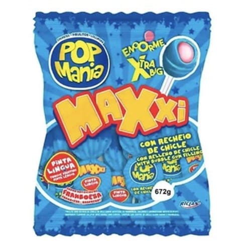 Pacote contendo 24 unidades de pirulito pinta língua recheado com chiclete Pop Mania Maxxi de 28 gramas cada. Total do pacote 672 gramas. Nos sabores Cereja Black e Framboesa Blue.