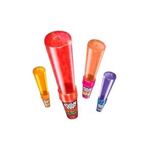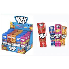 Caixa contendo 20 pirulitos Push Pop, de encaixar o dedo, com 15 gramas cada. Nos sabores Morango, Frutas Vermelhas, Laranja e Framboesa. Peso total da embalagem 300 gramas.