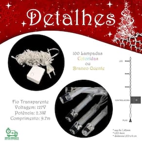 Pisca Pisca Cordão 100 Leds Natal 10 Metros 8 Funções 127V Decore sua casa e arvore de natal com esse cordão de pisca-pisca Esse Pisca-pisca conta com 9,7 metros e 100 lâmpadas pra deixar sua decoração ainda mais completa e mágica Toda extensão do cordão é transparente e esse cordão é ideal para ambiente INTERNO.
