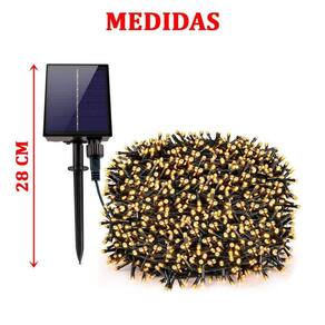 Cor: Dourada; Material: Plástico ABS, Componentes Eletrônicos e Metal; Medidas: Altura 28cm X Comprimento 100 Metros; Alimentação: Solar/Bateria; LEDs: 1000; Proteção: IP65; funções: 6; Conteúdo da Embalagem: