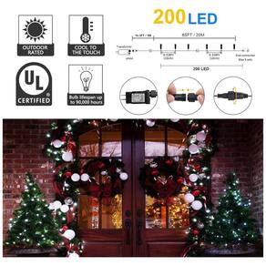 Luzes de Natal ao ar livre: luzes de cordas LED em azul e branco de baixa tensão de 29V. As luzes de cordas externas de 20,12 metros com 200 LEDs permitem um grande espaço de decoração. As decorações de Natal podem trazer às pessoas um ambiente mais caloroso e feliz durante os dias de folga.