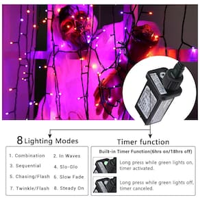 8 modos de iluminação e temporizador automático: estas luzes laranja e roxas de Halloween apresentam 8 modos de iluminação, basta pressionar o botão no adaptador para configurar seu show de iluminação favorito. O temporizador integrado manterá as luzes de Halloween ligadas por 6 horas e desligadas por 18 horas uma vez ativadas. Liberte as mãos e economize energia. Nota: Pressione o botão por 3 segundos até que uma luz verde acenda, o cronômetro será ativado