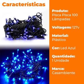 Pisca Pisca de Natal Cordão de Luz Led Azul 100 lâmpadas 127V - Casambiente NATAL196 Cordão de Luz Led Azul 100 Lâmpadas 127V Pisca Pisca - Casambiente Para uma decoração natalina completa e bem-feita, não pode faltar o Pisca Pisca de Natal Cordão de Luz Led Azul 100 lâmpadas 127V da Casambiente, com 6,5m de comprimento, variação de 8 frequências diferentes, tomada com duas pontas redondas e feito na cor verde escuro para que possa camuflar em sua árvore. Além de uma linda decoração natalina, o cordão de luz também é perfeito para decorar jardins, paredes de quartos, murais de foto, bares e muitos outros ambientes de uma forma diferente e inovadora. Impressione seus familiares e amigos com o Pisca Pisca de Natal Cordão de Luz Led Azul 100 lâmpadas 127V da Casambiente. Características: Marca: Casambiente Referência: NATAL196 Material: Plástico e Led Voltagem: 127V Comprimento: 6,5M Quantidade: 1 unidade Imagens Ilustrativas