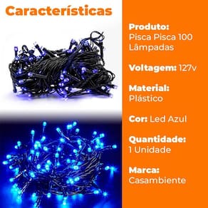 Pisca Pisca de Natal Cordão de Luz Led Azul 100 lâmpadas 127V - Casambiente NATAL196 Cordão de Luz Led Azul 100 Lâmpadas 127V Pisca Pisca - Casambiente Para uma decoração natalina completa e bem-feita, não pode faltar o Pisca Pisca de Natal Cordão de Luz Led Azul 100 lâmpadas 127V da Casambiente, com 6,5m de comprimento, variação de 8 frequências diferentes, tomada com duas pontas redondas e feito na cor verde escuro para que possa camuflar em sua árvore. Além de uma linda decoração natalina, o cordão de luz também é perfeito para decorar jardins, paredes de quartos, murais de foto, bares e muitos outros ambientes de uma forma diferente e inovadora. Impressione seus familiares e amigos com o Pisca Pisca de Natal Cordão de Luz Led Azul 100 lâmpadas 127V da Casambiente. Características: Marca: Casambiente Referência: NATAL196 Material: Plástico e Led Voltagem: 127V Comprimento: 6,5M Quantidade: 1 unidade Imagens Ilustrativas