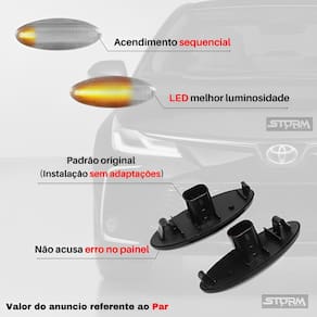 Pisca Seta Sequencial para Toyota Etios Sedan PAR Dinâmica Cor: Cristal Somos a Storm Parts, vendemos peças importadas e nacionais de alta qualidade e com , seu carro merece o melhor, ele merece as peças da Storm Parts. SETA PISCA SEQUENCIAL TOYOTA Produto totalmente plug and play, sem necessidade de adaptação, compatível com o modelo , não acende luz no painel, fácil instalação basta remover a luz e instalar a nossa luz LED, Anuncio referente ao PAR Lado Esquedo + Lado Direito Compatível com: Toyota Etios 2012, 2013, 2014, 2015, 2016, 2017, 2018, 2019, 2020, 2021, 2022 Toyota Etios Sedan 2012, 2013, 2014, 2015, 2016, 2017, 2018, 2019, 2020, 2021, 2022 Toyota Corolla XLI GLI 2009, 2010, 2011, 2012, 2013, 2014 Obs: compatível com as versões que possuem a seta no para-lama Especificações: Condição: novo com . Origem: Tipo: Pisca de direção lateral, acendimento sequencial Cor luz LED: âmbar Cor externa: Fume Potência: 3W - 5w Tensão: 12V Material: Caixa ABS + luzes LED Modelo: luz led Principais Perguntas: P. Possui R. Sim, todos nossos produtos emitimos em nome do comprador cadastrado. P. Necessita adaptação para instalar R. Não, produto plug and play, basta remover a seta e ligar e encaixar a nova. P. Acusa algum erro no painel do carro R. Não, produto totalmente compatível com os modelos listados acima, por possuir as mesmas especificações do não acende nem uma luz no painel. P. Anuncio é referente a uma unidade o par R. Anuncio referente ao par Lado direito + Lado esquerdo P. Qual a condição do produto R. Vendemos somente produtos novos e lacrados Apesar de fácil Instalação recomendamos a instalação por um profissional. Tenha tranquilidade de comprar com quem está disposto a oferecer o melhor atendimento, caso precise de ajuda antes ou após a compra, conte com a nossa equipe de atendimento para lhe ajudar.