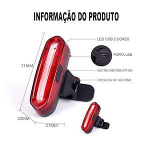 Feita com materiais plásticos de alta qualidade, esta lanterna traseira LED é resistente a chuva e recarregável via USB.Ideal para viagens, ciclismo e atividades ao ar livre, tem pulseira de borracha com regulagem de ângulo e alça de liberação rápida, encaixando-se facilmente no guidão e canote, podendo ser instalado na vertical ou horizontal na bike;