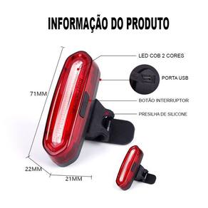 Feita com materiais plásticos de alta qualidade, esta lanterna traseira LED é resistente a chuva e recarregável via USB.Ideal para viagens, ciclismo e atividades ao ar livre, tem pulseira de borracha com regulagem de ângulo e alça de liberação rápida, encaixando-se facilmente no guidão e canote, podendo ser instalado na vertical ou horizontal na bike;