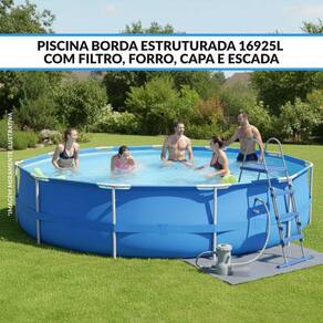 Itens inclusos: 1 Piscina, 1 Escada, 1 Forro, 1 Capa, 1 Bomba Filtrante, 1 Kit Reparo, 1 Manual