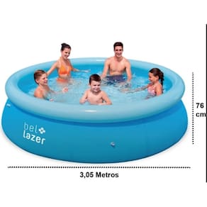 Especificações técnicas Formato: Redonda Diâmetro: 3,05m Estrutura: PVC, Poliéster Adesivo Reparo: Sim Capacidade: 4.600 Litros / Usuários: 4 Adultos Cor: Azul Dimensões aproximadas montado (C x L x A): 305 cm x 305 cm x 76 cm Garantia: 3 Meses Material: Poliéster Marca: BEL FIX