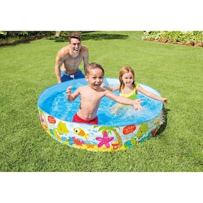 Esta piscina Snapset Dia de Praia da Intex é muito fácil de instalar. Não é necessário inflar, basta desenrolar e encher com água. Construído com paredes laterais pesadas e inferior para diversão de longa duração. Faça de conta que você está na praia nesta piscina projetada para a praia com paredes laterais transparentes. Adequado para idades de 3 anos ou mais. O tamanho aproximado de montagem é de 1.52m x 25cm com uma capacidade de 450L e uma altura de parede de 24cm. Personagens divertidos manterão seus filhos entretidos neste verão. Faixa etária: 3+Tamanho: 1.52x25cmCapacidade: 450lMaterial: vinil