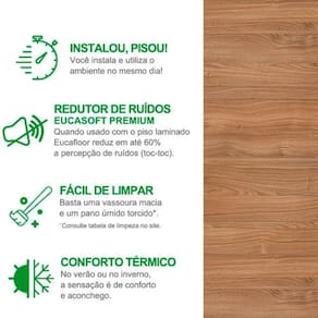 Recomendações de Uso, Manutenção e Limpeza: A limpeza deve ser feita com aspirador de pó (exceto aspiradores com tubo de sucção que raspam o piso) ou vassoura de cerdas macias e um pano úmido bem torcido em solução de produtos domésticos de limpeza isentos de cera ou silicone. Eventualmente (uma vez por semana), a limpeza poderá ser feita diluindo uma ou duas tampas do Pratice Limpador de Laminados ou detergente neutro em 1 litro d'água. Molhe o pano nesta mistura, torça-o bem e aplique sobre o piso.Nunca utilize material cortante ou abrasivo, cera ou enceradeiras elétricas, esponja de aço, lixa ou produtos à base de silicone