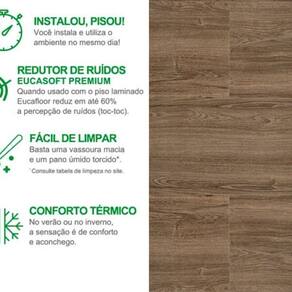 Recomendações de Uso, Manutenção e Limpeza: A limpeza deve ser feita com aspirador de pó (exceto aspiradores com tubo de sucção que raspam o piso) ou vassoura de cerdas macias e um pano úmido bem torcido em solução de produtos domésticos de limpeza isentos de cera ou silicone. Eventualmente (uma vez por semana), a limpeza poderá ser feita diluindo uma ou duas tampas do Pratice Limpador de Laminados ou detergente neutro em 1 litro d'água. Molhe o pano nesta mistura, torça-o bem e aplique sobre o piso.Nunca utilize material cortante ou abrasivo, cera ou enceradeiras elétricas, esponja de aço, lixa ou produtos à base de silicone