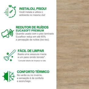 Recomendações de Uso, Manutenção e Limpeza: A limpeza deve ser feita com aspirador de pó (exceto aspiradores com tubo de sucção que raspam o piso) ou vassoura de cerdas macias e um pano úmido bem torcido em solução de produtos domésticos de limpeza isentos de cera ou silicone. Eventualmente (uma vez por semana), a limpeza poderá ser feita diluindo uma ou duas tampas do Pratice Limpador de Laminados ou detergente neutro em 1 litro d'água. Molhe o pano nesta mistura, torça-o bem e aplique sobre o piso.Nunca utilize material cortante ou abrasivo, cera ou enceradeiras elétricas, esponja de aço, lixa ou produtos à base de silicone